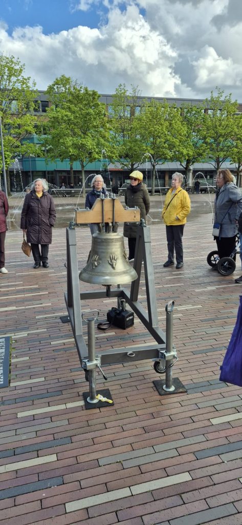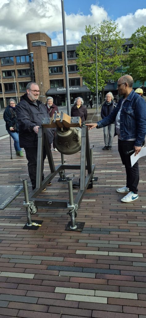 Die Friedensglocke stand im Mittelpunkt des Abendfriedens, den der Eritreische Kultur- und Sozialverein am 19. April auf dem Pariser Platz ausgerichtet hat. Jonas Tekleyes beschrieb, dass es auf der Welt Friedensglocken gibt, die uns alle immer wieder ermutigen, uns mit Respekt und Toleranz zu begegnen und Konflikte ohne Gewalt zu lösen. Die wohl bekannteste Friedensglocke steht im Hiroschima Peace Momorial Park in Japan und soll an den Atombombenabwurf auf die Stadt Hiroschima erinnern. Auf der Glocke ist eine Weltkarte ohne Grenzen zu sehen. Das bedeutet, dass alle Menschen zusammengehören, egal aus welchem Land sie kommen. Besucher dürfen die Glocke selbst läuten, um ein Zeichen für den Frieden zu setzen.