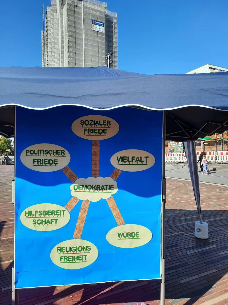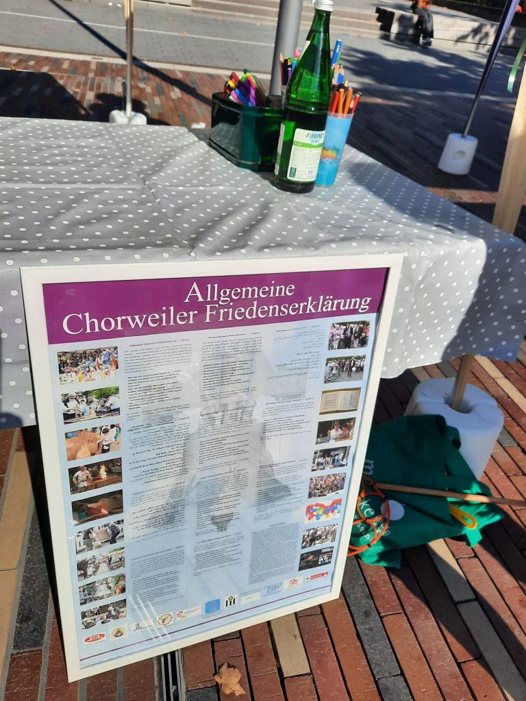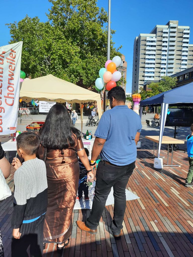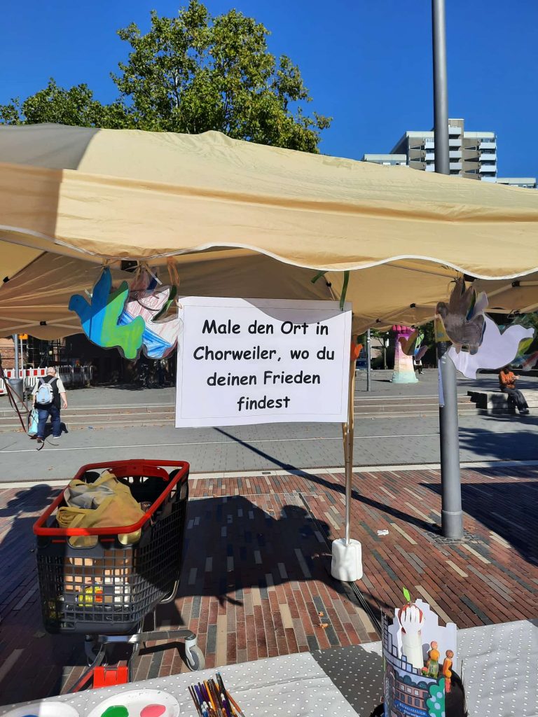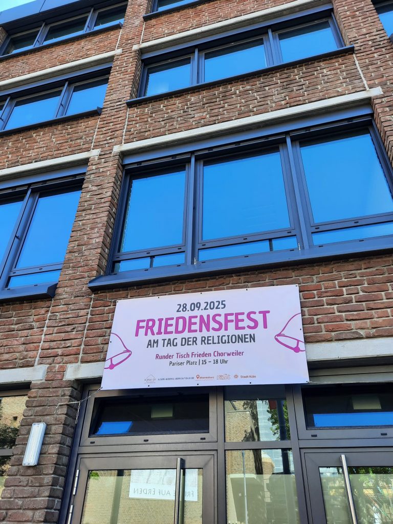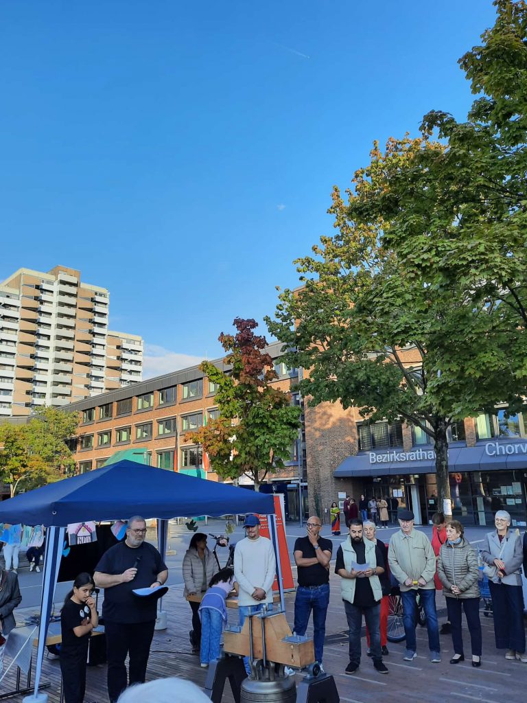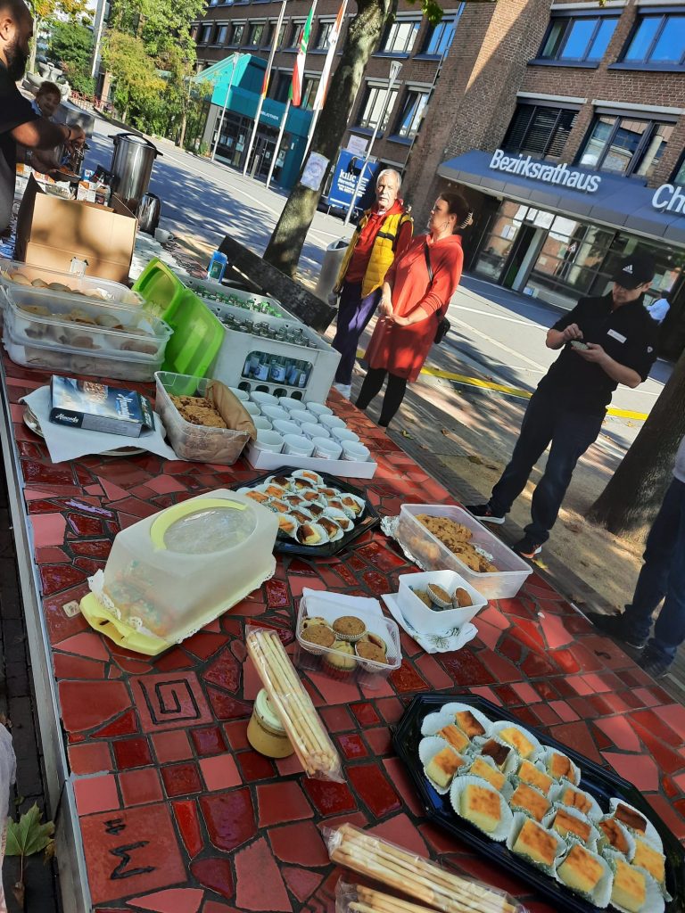 Der Runde Tisch Frieden Chorweiler feierte am 28.September auf dem Pariser Platz ein Friedensfest. Im Zeichen der Demokratie und des friedlichen Miteinanders standen Vertreter*innen der Glaubens- und Religionsgemeinschaften im bunten Zelt auf dem Pariser Platz zusammen. Sie beantworteten Fragen, kamen in den Austausch über ihren Glauben. Der herrliche blaue Himmel und der Sonnenschein luden viele Menschen zum gemeinsamen Essen und Trinken am Tisch der Nationen ein. Bunt gedeckt mit den köstlichsten Leckereien aus aller Welt und Kaffee und Kuchen ergaben sich gute Begegnungen und Gespräche.