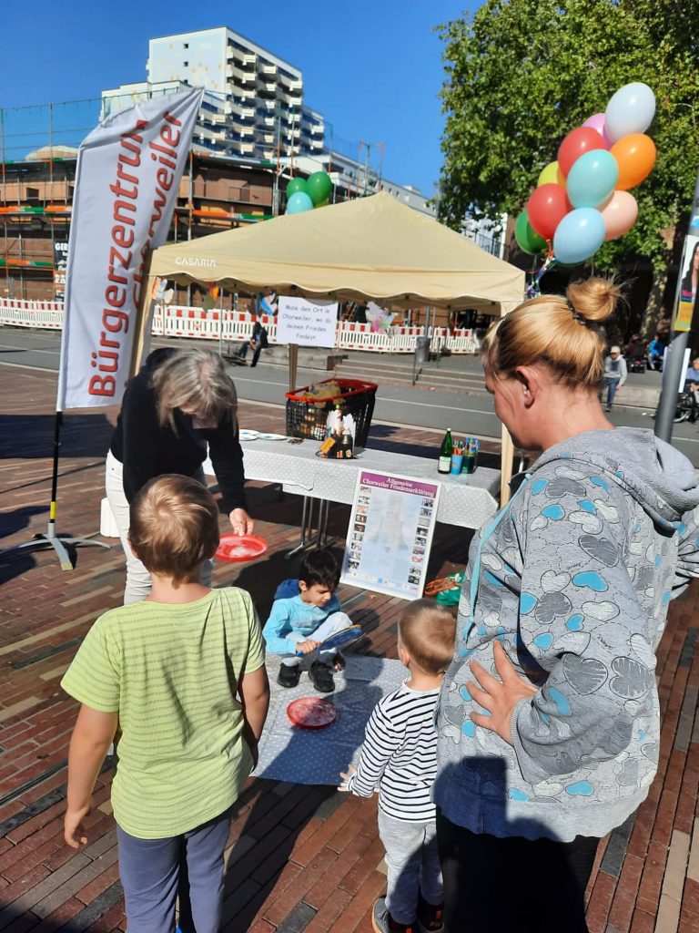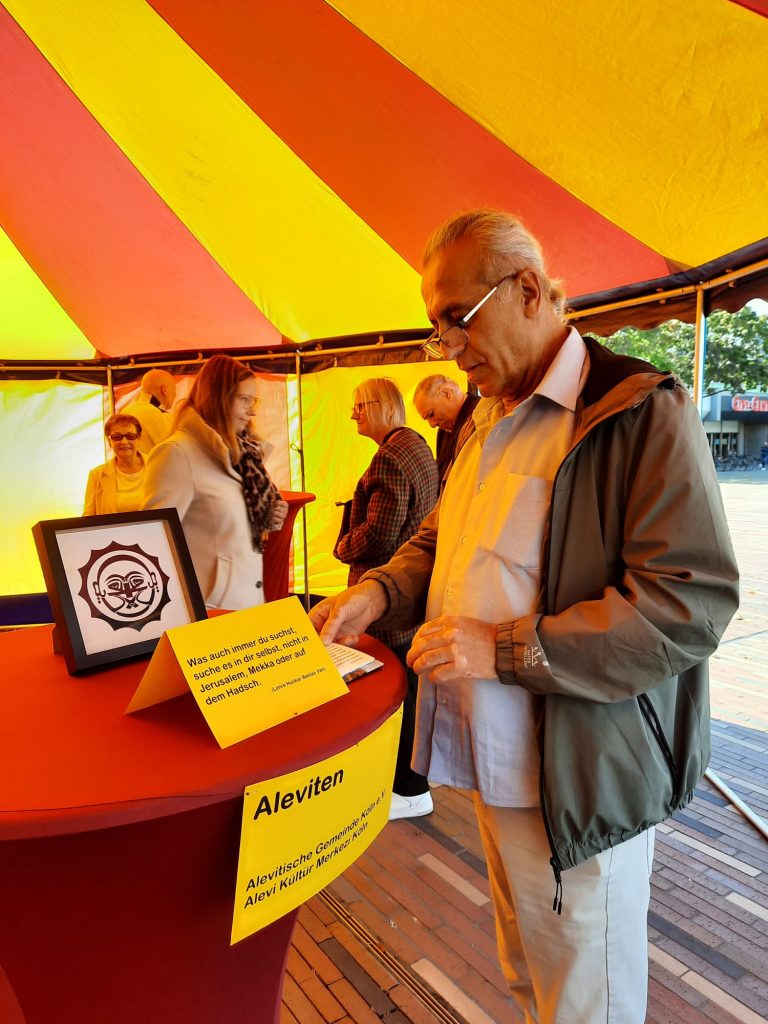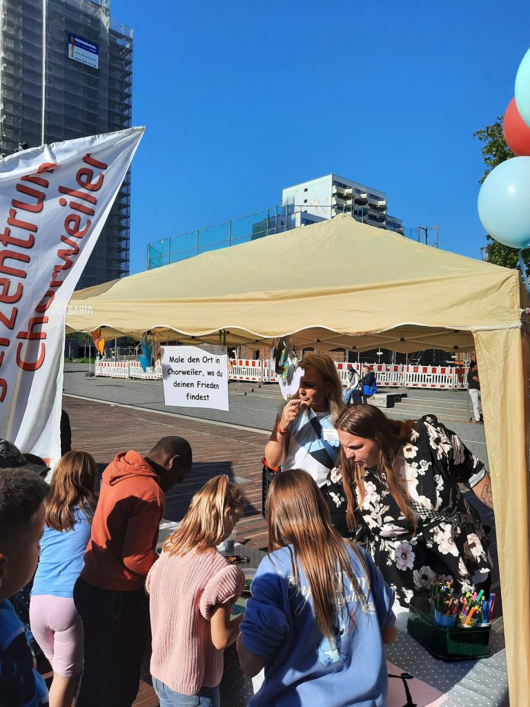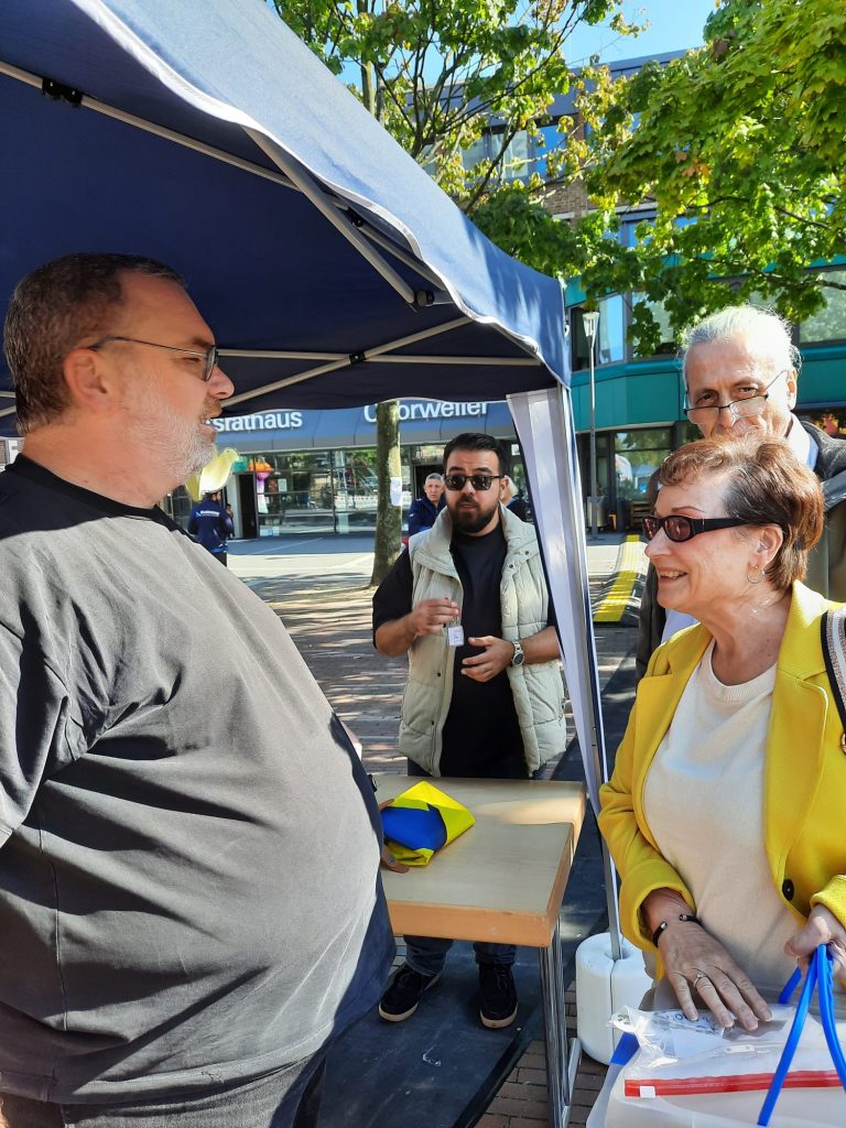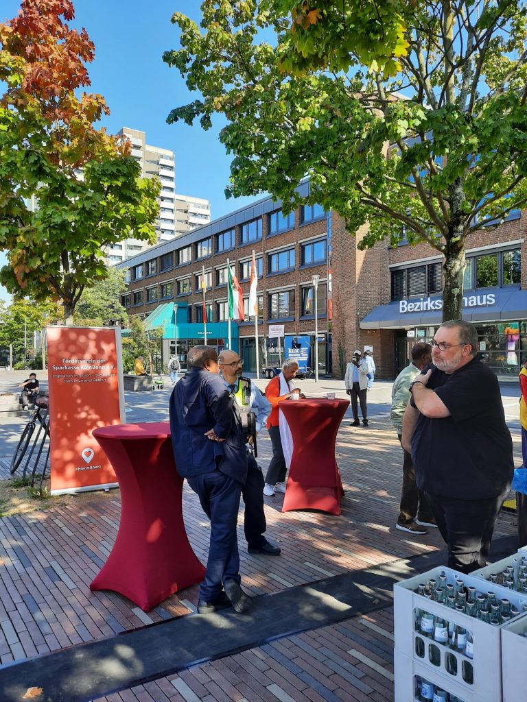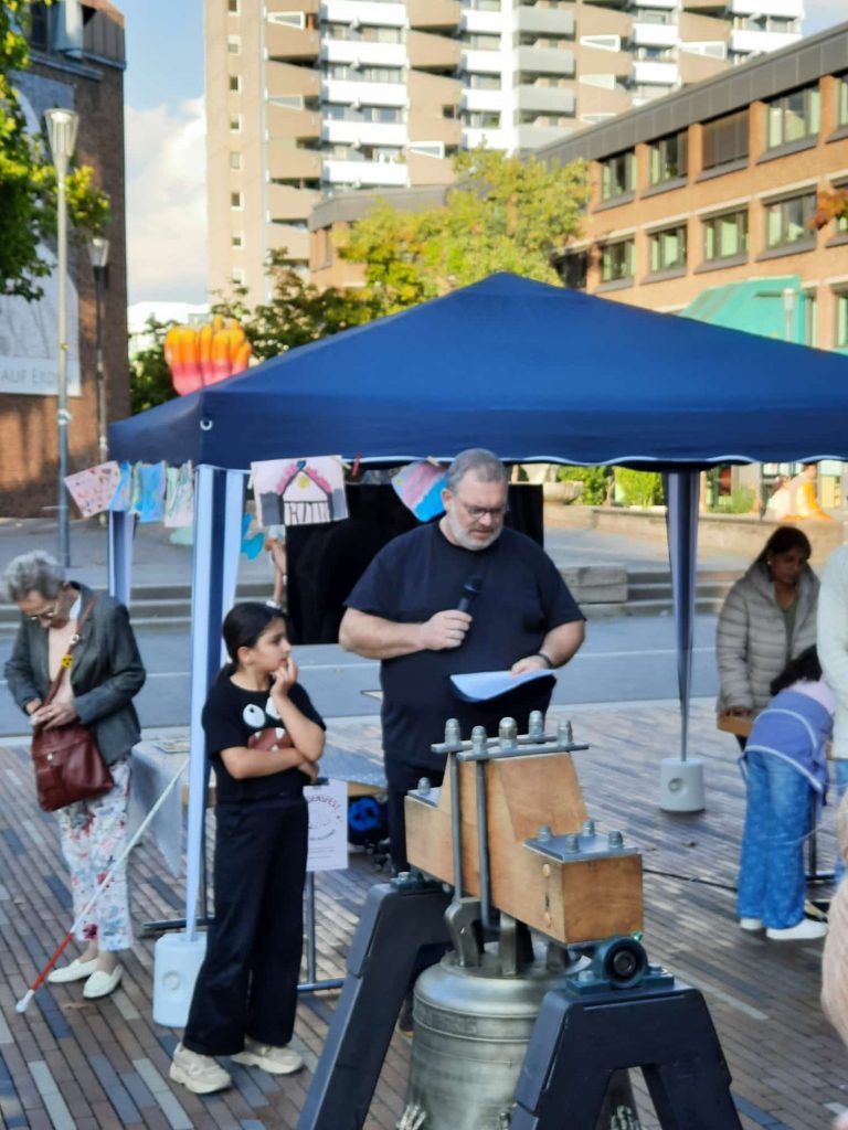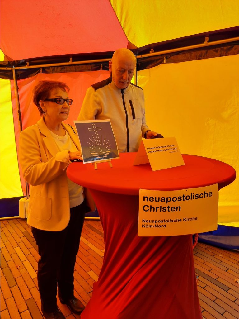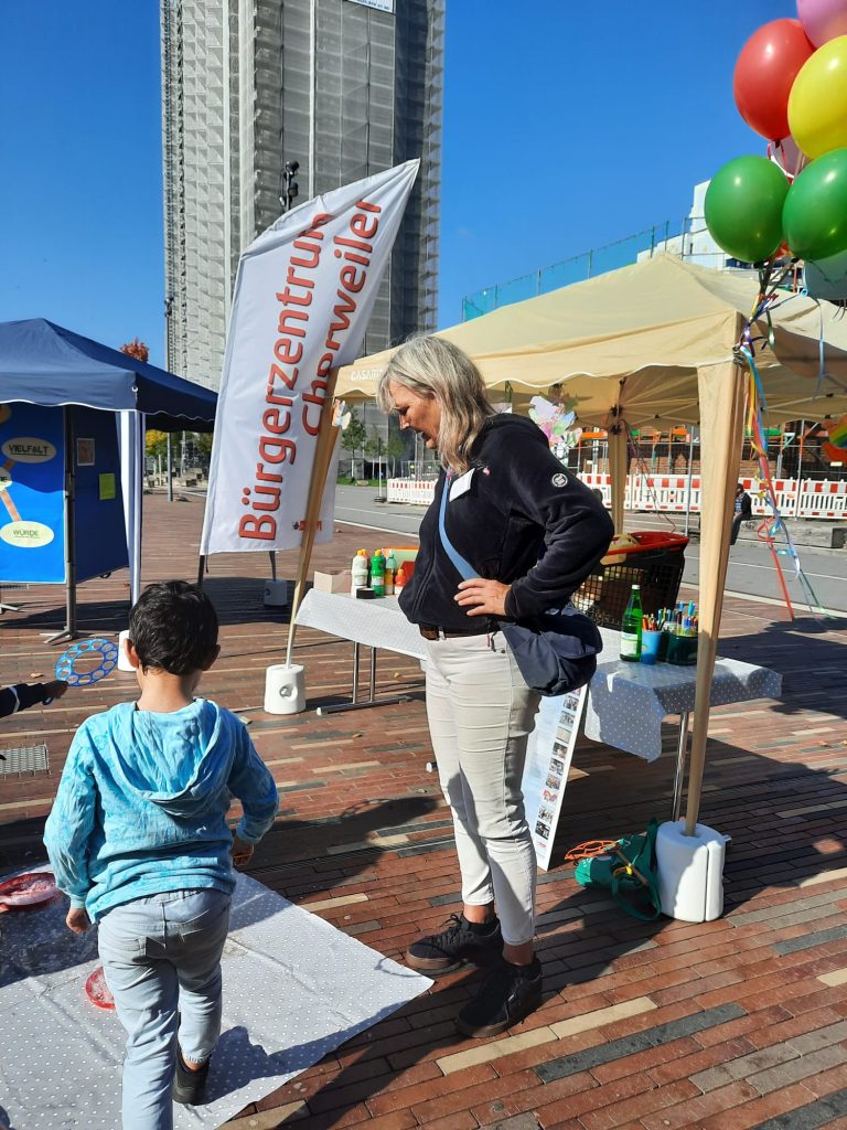 Der Runde Tisch Frieden Chorweiler feierte am 28.September auf dem Pariser Platz ein Friedensfest. Im Zeichen der Demokratie und des friedlichen Miteinanders standen Vertreter*innen der Glaubens- und Religionsgemeinschaften im bunten Zelt auf dem Pariser Platz zusammen. Sie beantworteten Fragen, kamen in den Austausch über ihren Glauben. Der herrliche blaue Himmel und der Sonnenschein luden viele Menschen zum gemeinsamen Essen und Trinken am Tisch der Nationen ein. Bunt gedeckt mit den köstlichsten Leckereien aus aller Welt und Kaffee und Kuchen ergaben sich gute Begegnungen und Gespräche.