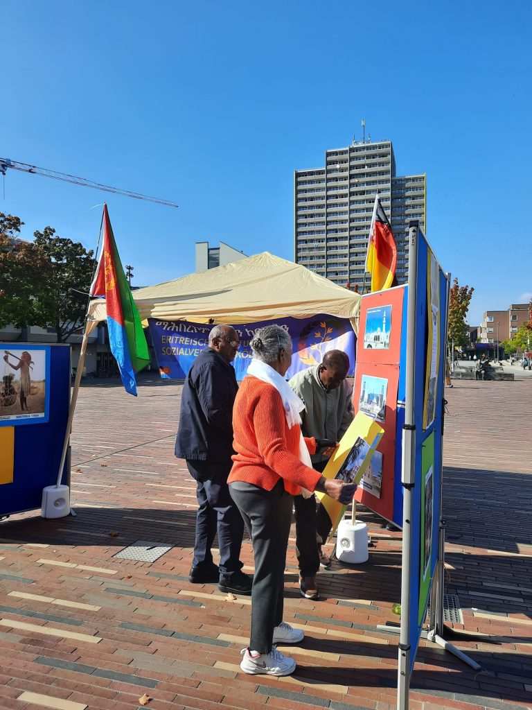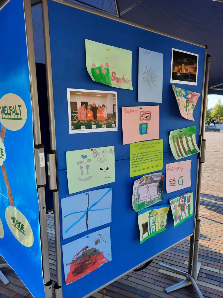 Kinder konnten ihren friedlichen Ort am Stand des Bürgerzentrums malen. Ein besonderer Favorit im Stadtteil, Bezirk für die Kinder ist die Stadtbibliothek. Sie ist an diesem schönen Nachmittag häufig gemalt worden. Angeregte Gespräche ergaben sich auch rund um das Zelt und der Eritreische Sozial- und Kulturverein weckte mit seinen fotografischen Eindrücken Interesse auf Austausch.